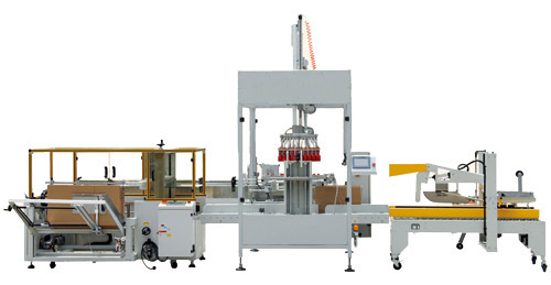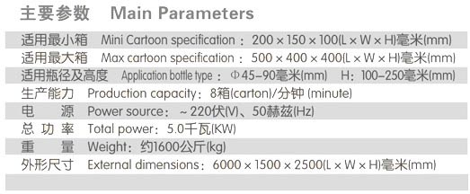 配套瓶裝生產(chǎn)線的后道全自動裝箱生產(chǎn)。同時擁有多項國家技術(shù),整機(jī)性能可靠,產(chǎn)能高,包裝效果美觀。